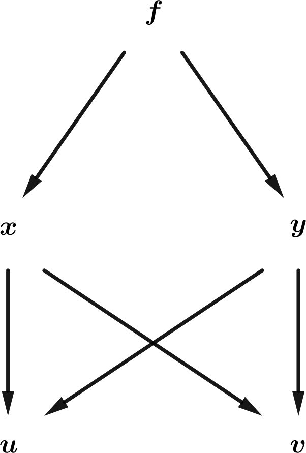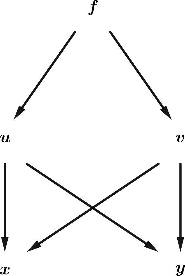 An easy way to remember such formulas is to use a tree diagram, as shown in the first diagram in Figure 7.1. To use a tree diagram, determine which derivative you want to take, in this case the derivative of \(f\) with respect to \(u\text{.}\) Now follow all possible paths from \(f\) to \(u\text{,}\) with each arrow corresponding to a derivative of the “top” quantity with respect to the “bottom” quantity, and where in each case the variable(s) not pointed to by the arrow are to be held constant.