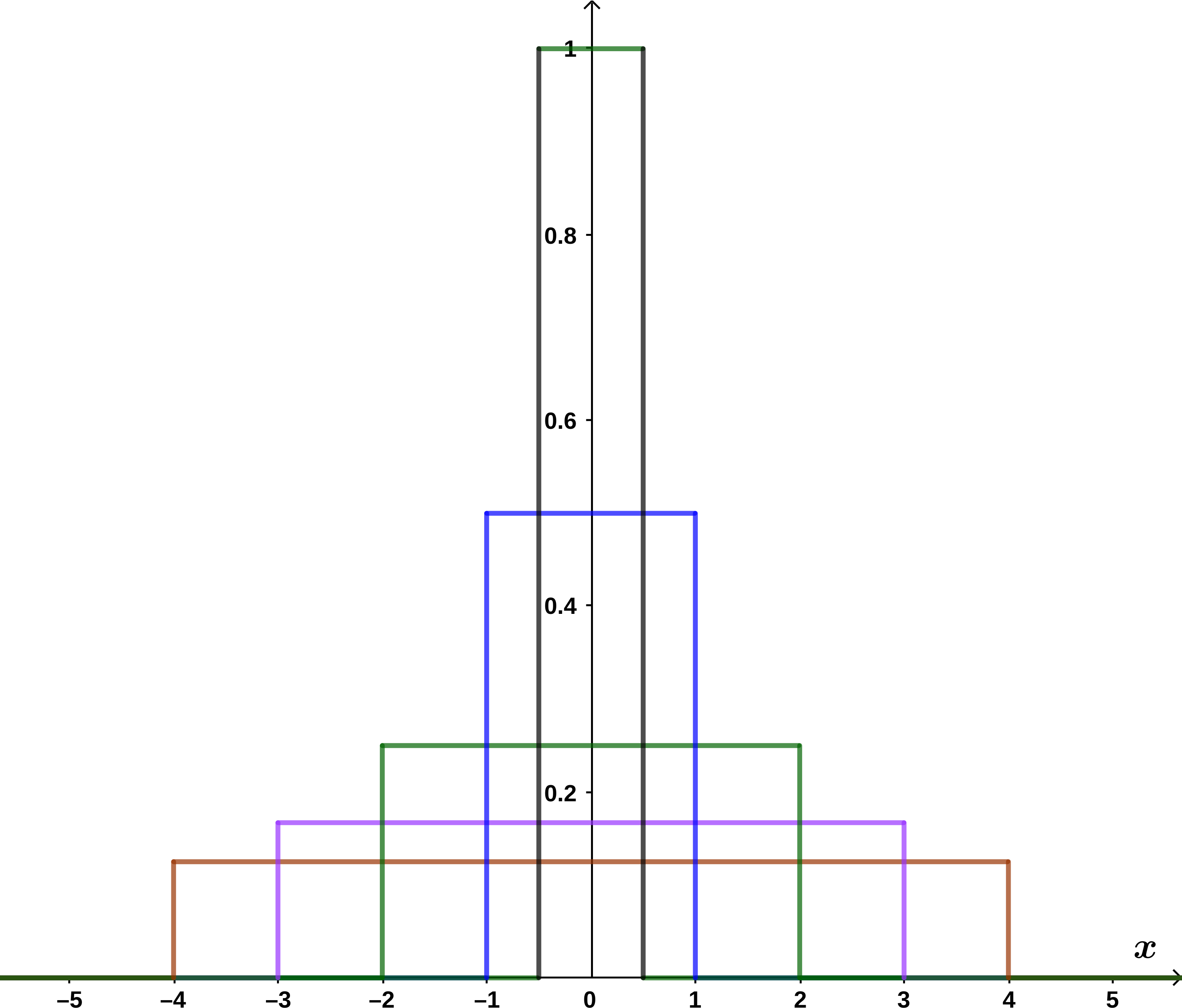Figure 17.14. The function \(\delta(x)\) can be approximated by a series of steps that get progressively thinner and higher in such a way that the area under the curve is always equal to one.