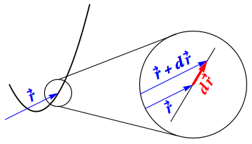 Figure8.1.The infinitesimal displacement vector \(d\rr\) along a curve, shown in an “infinite magnifying glass”. In this and subsequent figures, artistic license has been taken in the overall scale and the location of the origin in order to make a pedagogical point.