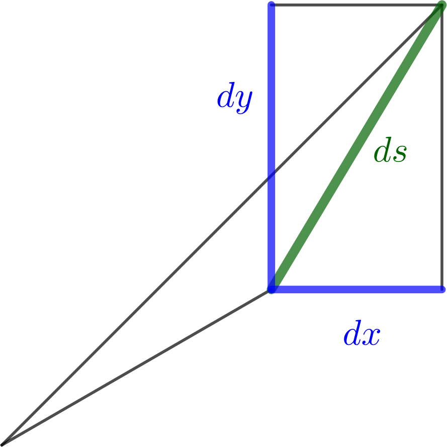 Figure8.2.The first figure shows the rectangular components of the vector differential \(d\rr\) in two dimensions, while the second figure shows the infinitesimal version of the Pythagorean Theorem.