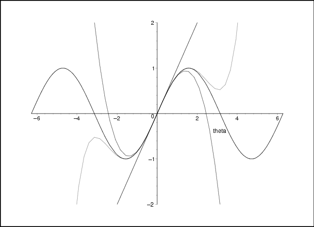 This computer algebra worksheet began by approximating \(\sin\theta\) by \(\theta\) near the origin. This small angle approximation may be familiar to you from your study of the motion of a pendulum. Higher order terms add more higher order polynomials and therefore add more “bumps” to the curve; the graph of \(\sin\theta\) has infinitely many bumps. It is remarkable that the power series for \(\sin\theta\) converges for all values of \(\theta\text{.}\)