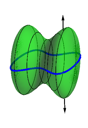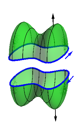 for any vector field \(\FF\text{.}\) Consider a closed surface. Cut it in half along some closed curve, as shown in the first diagram in Figure 12.20. Then each piece of the surface is a butterfly net with the same rim, as shown in the second diagram in Figure 12.20 (with the pieces separated for clarity). Applying Stokes’ Theorem to each piece leads to the conclusion that the flux of the curl of \(\FF\)upward through each piece must be the same, so that the flux up through the top cancels the flux downward through the bottom. This cancellation forces the flux of the curl of \(\FF\)outward through the entire surface to vanish. Using the Divergence Theorem, we get