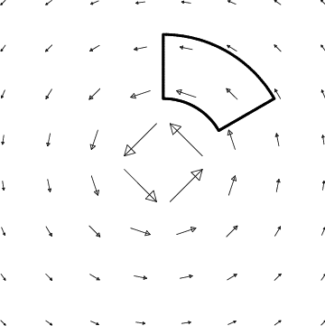 The figures above help us determine the curl at the origin, but not elsewhere. The curl is a vector field, which can vary from point to point. We therefore need to examine loops which are not at the origin. It is useful to adapt the shape of our loop to the vector field under consideration. Both of our vector fields are better adapted to polar coordinates than to rectangular coordinates, so we use polar boxes. Can you determine the (\(\kk\)-component of the) curl using the loops in Figure 12.16? Imagine trying to do the same thing with a rectangular loop, or even a circular loop.
