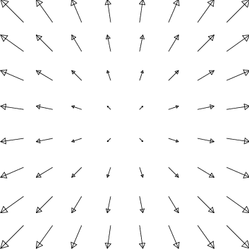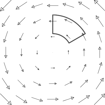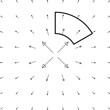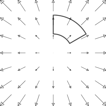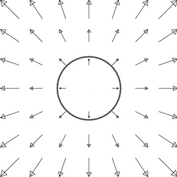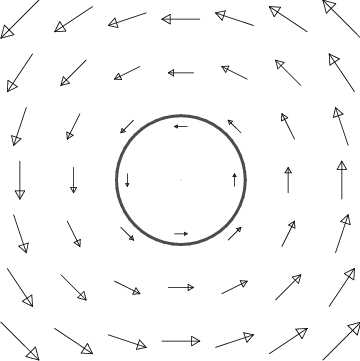 Finally, it is important to realize that not all vector fields which point away from the origin have divergence. The example in Figure 12.9 demonstrates this important principle; it has no divergence away from the origin. This figure represents a solution of Maxwell’s equations for electromagnetism, and describes the electric field of an infinite charged wire